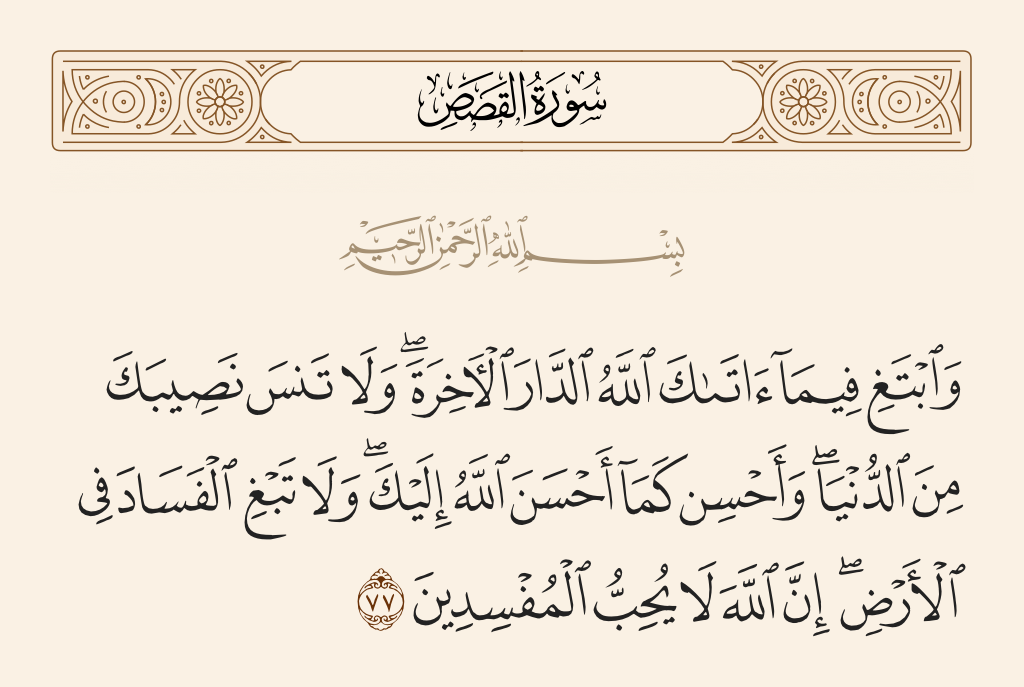 وَابْتَغِ فِيمَا آتَاكَ اللَّهُ الدَّارَ الْآخِرَةَ ۖ وَلَا تَنْسَ نَصِيبَكَ مِنَ الدُّنْيَا ۖ وَأَحْسِنْ كَمَا أَحْسَنَ اللَّهُ إِلَيْكَ ۖ وَلَا تَبْغِ الْفَسَادَ فِي الْأَرْضِ ۖ إِنَّ اللَّهَ لَا يُحِبُّ الْمُفْسِدِينَ