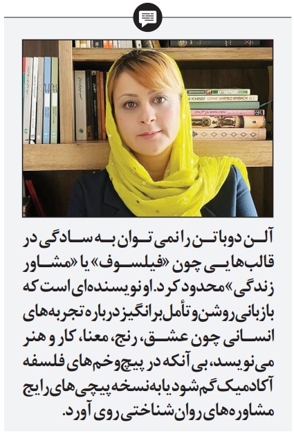 از دید شما، آلن دوباتن برای مخاطب ایرانی بیشتر یک فیلسوف است؟ یا یک مشاور زندگی؟ به نظر شما، او را چگونه باید به خواننده فارسیزبان معرفی کرد؟