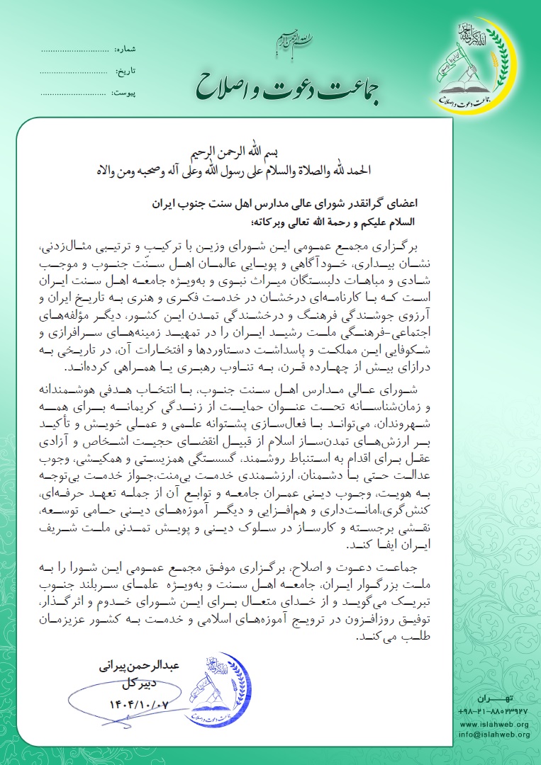 جماعت دعوت و اصلاح، برگزاری موفق مجمع عمومی این شورا را به ملت بزرگوار ایران، جامعهی اهل سنت و بهویژه علمای سربلند جنوب تبریک میگوید و از خدای متعال برای این شورای خدوم و اثرگذار، توفیق روزافزون در ترویج آموزههای اسلامی و خدمت به کشور عزیزمان طلب میکند.