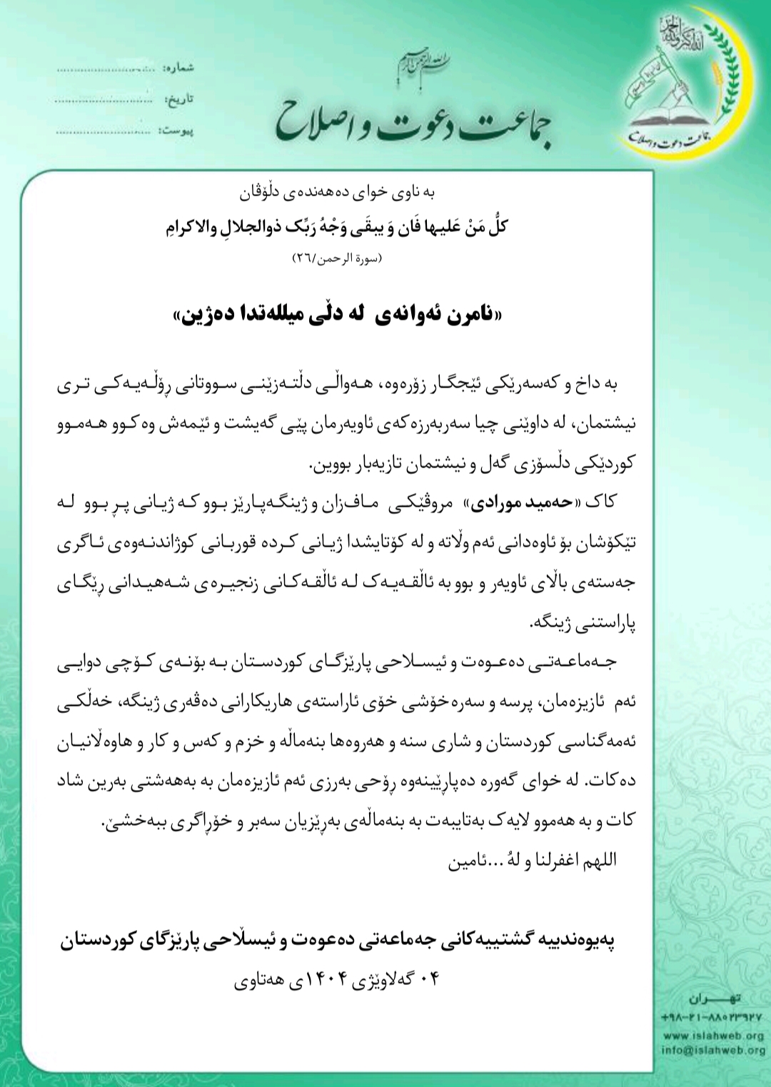 جهماعهتی دهعوهت و ئیسلاحی پارێزگای کوردستان به بۆنهی کۆچی دوایی ئهم ئازیزهمان، پرسه و سهرهخۆشی خۆی ئاراستهی هاریکارانی دهڤهری ژینگه، خهڵکی ئهمهگناسی کوردستان و شاری سنه و ههروهها بنهماڵه و خزم و کهس و کار و هاوهڵانیان دهکات. له خوای گهوره دهپاڕێینهوه ڕۆحی بهرزی ئهم ئازیزهمان به بهههشتی بهرین شاد کات و به ههموو لایهک بهتایبهت به بنهماڵهی بهڕێزیان سهبر و خۆڕاگری ببهخشێ.