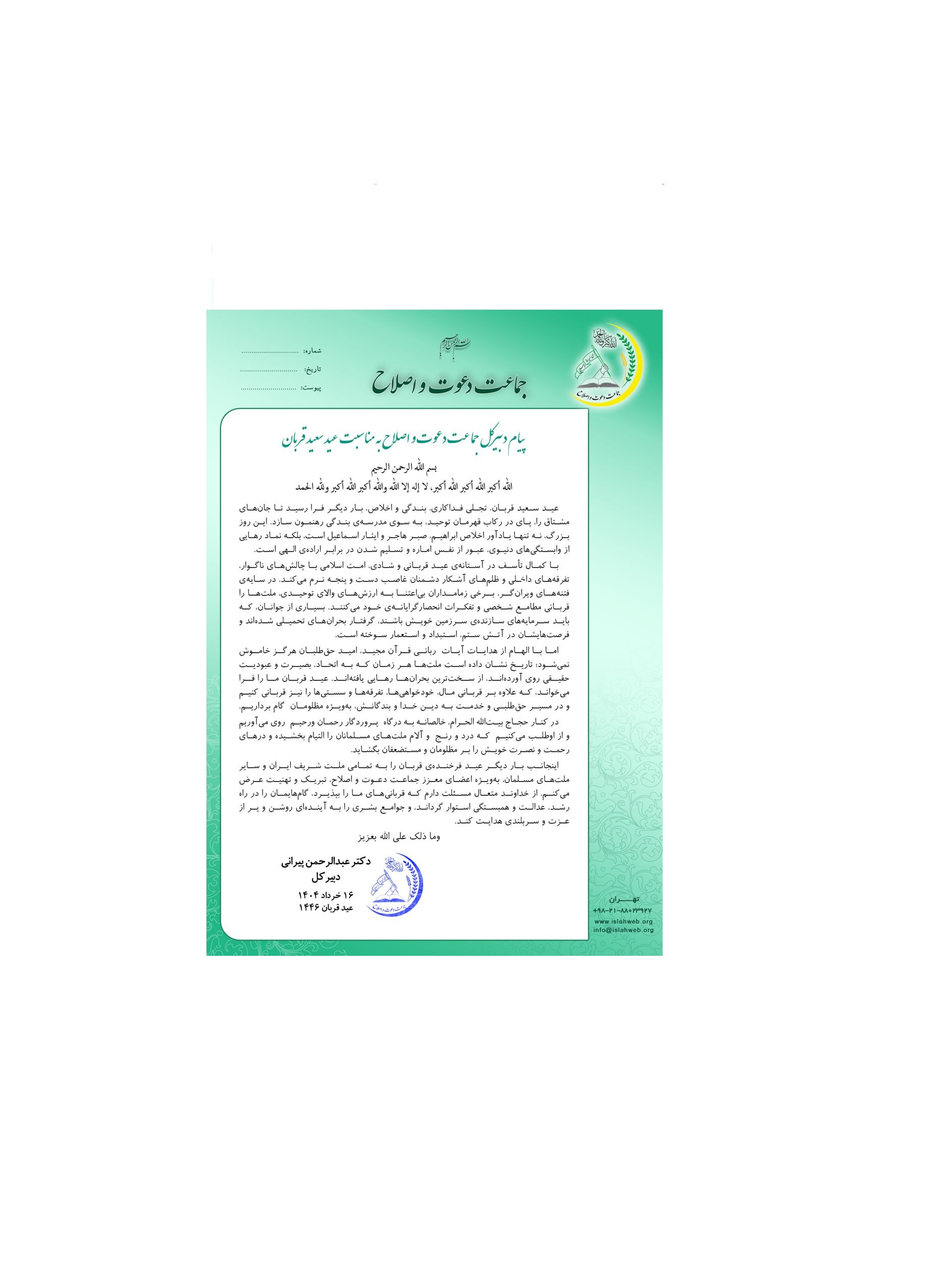 في رسالته التي بعثها بمناسبة عيد الأضحى المبارك وصف الأستاذ عبد الرحمن بيراني، الأمين العام لجماعة الدعوة والإصلاح هذا اليوم العظيم بأنه مظهر من مظاهر الإخلاص الإبراهيمي، وفرصة للتضحية بالفرقة والأنانية والكسل. وأشار إلى معاناة الأمة الإسلامية، داعيًا إلى العودة إلى الوحدة والعبودية الحقيقية ونصرة المظلومين.