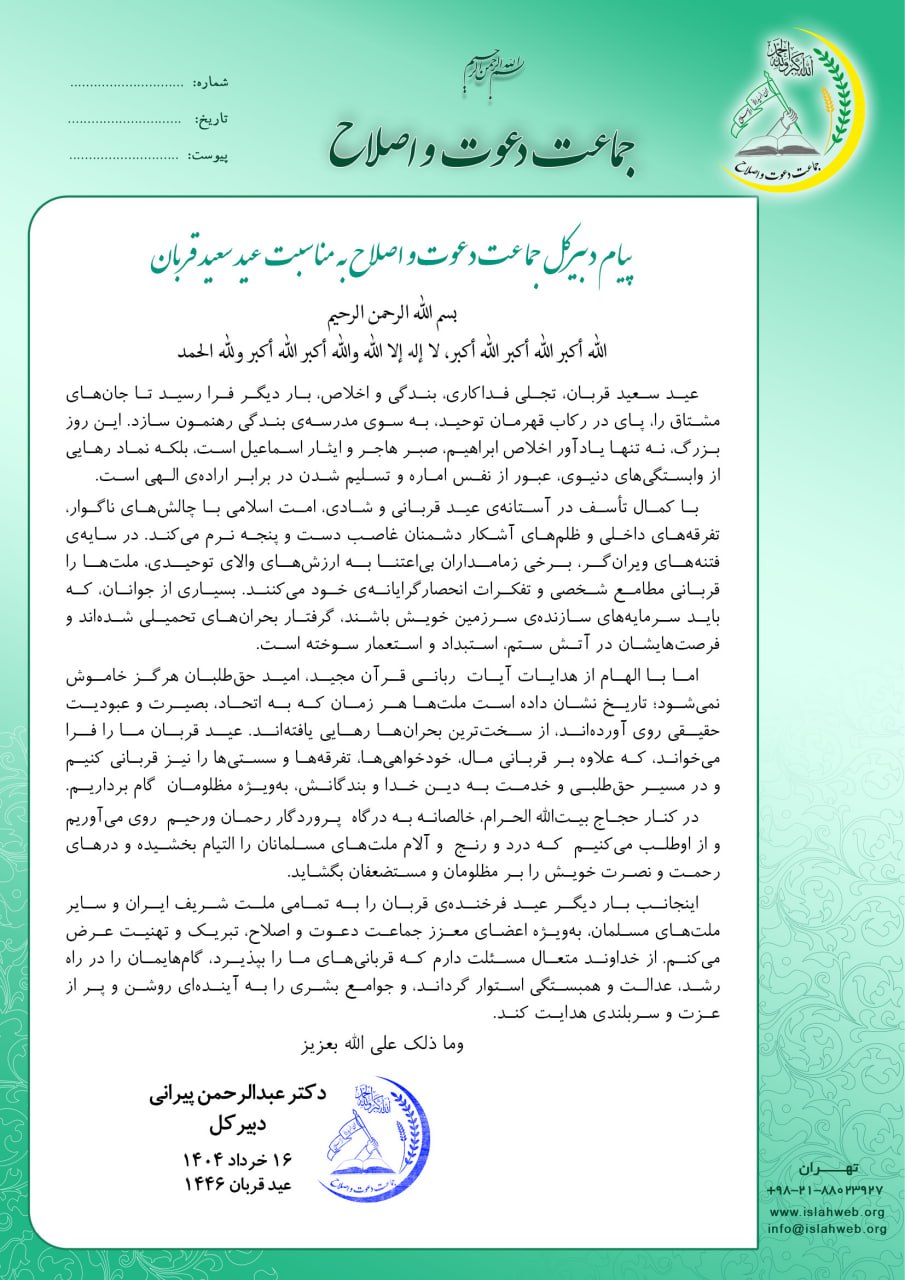 مرة أخری أزف أحلی التهاني وأجمل التبريكات بمناسبة عيد الأضحى المبارك إلی جميع أبناء الشعب الإيراني النبيل وسائر الشعوب الإسلامية، وخاصةً أعضاء جماعة دعوة الإصلاح الكرام سائلاً العلي القدير أن يتقبل تضحياتنا، وأن يُثبّت أقدامنا على درب النمو والعدل والتضامن، وأن يهدي المجتمعات الإنسانية إلى مستقبلٍ مشرقٍ ملؤه الكرامة والعزة وما ذلک علی الله بعزیز.