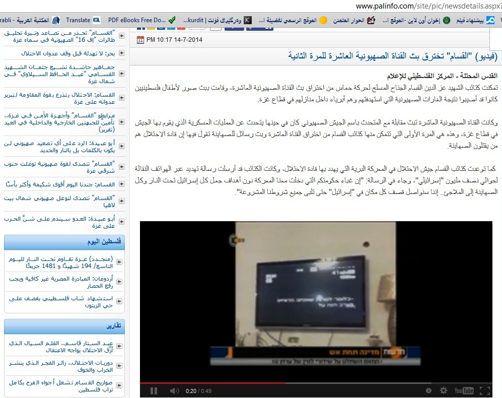 «گردانهای شهید عزالدین قسام» شاخه نظامی حماس موفق شد پخش خبری کانال دهم صهیونیستها را هک نموده و اقدام به نشر عکسهای کودکان بیدفاع فلسطینی نماید که در تجاوزهای کنونی اسرائیل مورد اصابت قرار گرفتهاند.