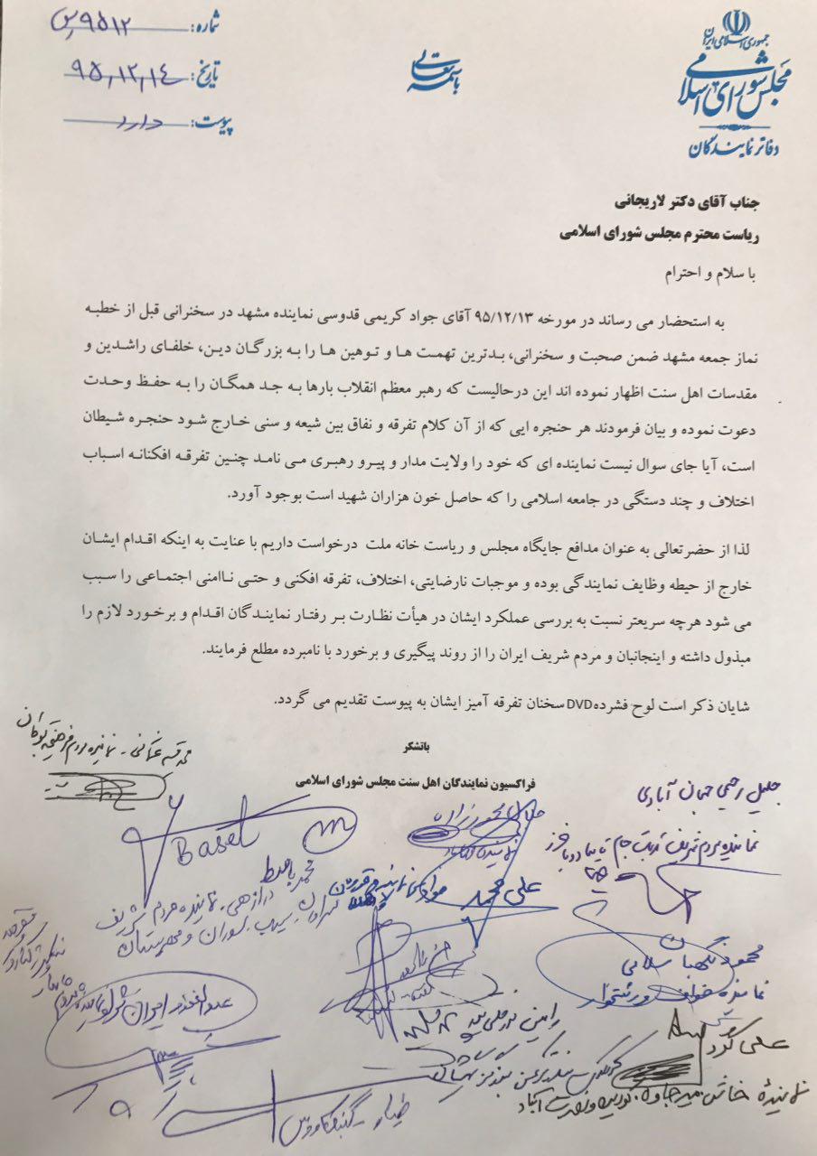 جمعی از نمایندگان فراکسیون اهل سنت مجلس شورای اسلامی، سخنان نماینده مشهد در خطبههای نماز جمعه این شهر را «تفرافکنانه» و «اسباب تخلف» خواندند و خواستار برخورد با این نماینده شدند.
