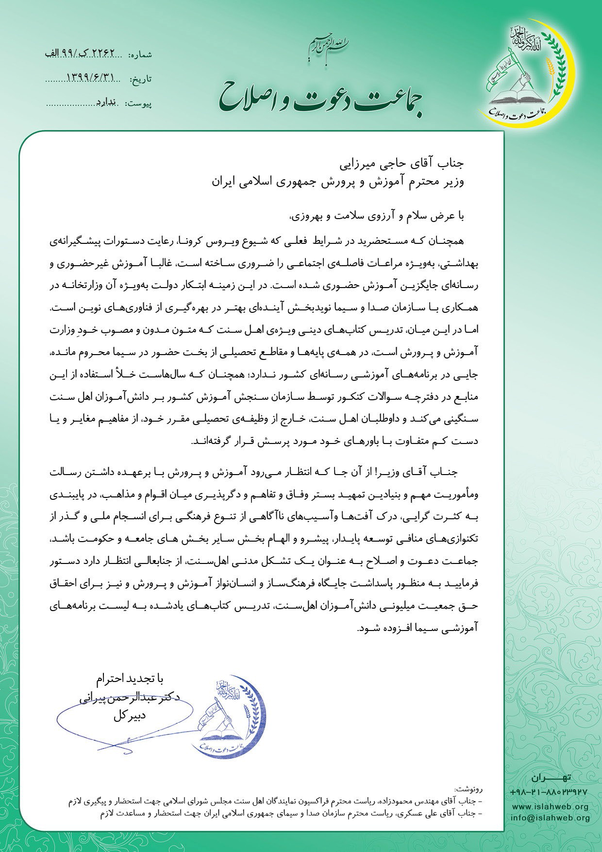 دکتر عبدالرّحمن پیرانی دبیرکلّ جماعت دعوت و اصلاح تشکّل مدنی ایرانیان اهلسنّت در نامهای به وزیر آموزش و پرورش خواستار احقاق حقّ دانشآموزان سنّیمذهب در برنامههای آموزشی شد.