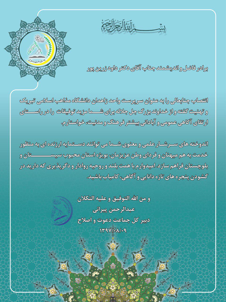 دکترعبدالرّحمن پیرانی، دبیرکلّ جماعت دعوت و اصلاح در پیامی به دکتر داود زرّینپور، انتصاب وی را بهعنوان سرپرست واحد زاهدان دانشگاه مذاهب اسلامی، تبریک گفت.