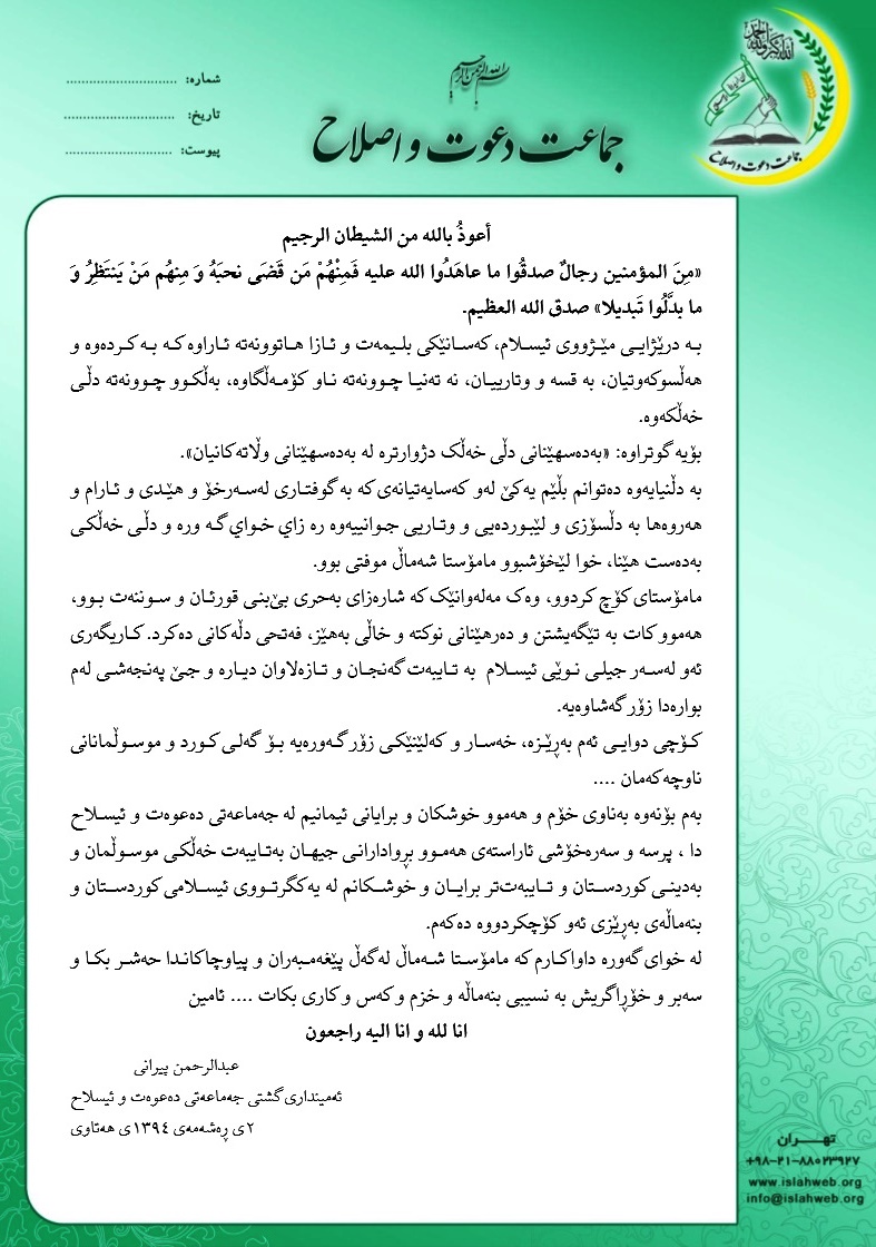 دکتر عبدالرّحمن پیرانی، «دبیرکلّ جماعت دعوت و اصلاح» با صدور پیامی، درگذشت عالم ربّانی، ماموستا عبدالله ابراهیمی را به بازماندگان، علمای اعلام و مردم سردشت تسلیت گفت.