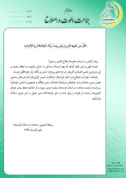 در پی درگذشت بانو «فرحناز رحمتی» همسر ارجمند ماموستا صلاحالدین رحمتی از اعضای رسمی جماعت در دفتر سنندج، روابط عمومی شعبەی کردستانی پیام تسلتی به شرح زیر صادر کرد: