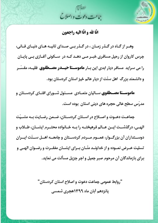 روابط عمومی جماعت شعبهی کردستان درگذشت ماموستا حیدر مصطفوی مفسر و فقیه کردستانی را تسلیت گفت.