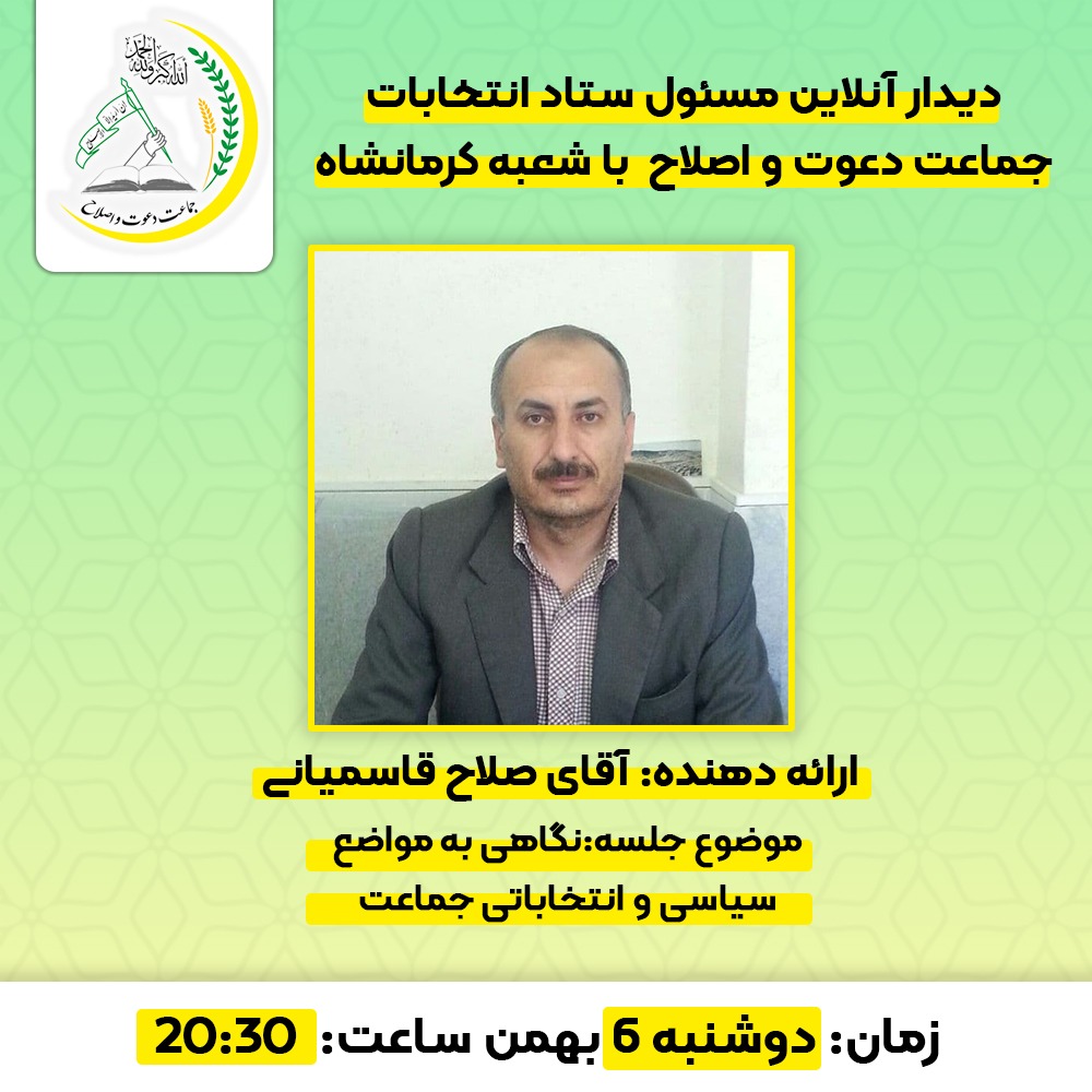 دیدار آنلاین صلاح قاسمیانی عضو هیأت اجرایی مرکزی و مسؤول ستاد انتخابات جماعت با اعضای شعبهی کرمانشاه در شامگاه ۶ بهمنماه ۹۹ برگزار شد.