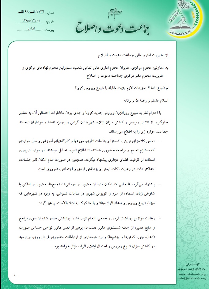 مدیریت اداری مالی جماعت دعوت و اصلاح طیّ نامهای از اعضا و هواداران این تشکّل مدنی خواست با اتّخاذ تمهیدات لازم به مقابله با شیوع ویروس کرونا اقدام کنند.