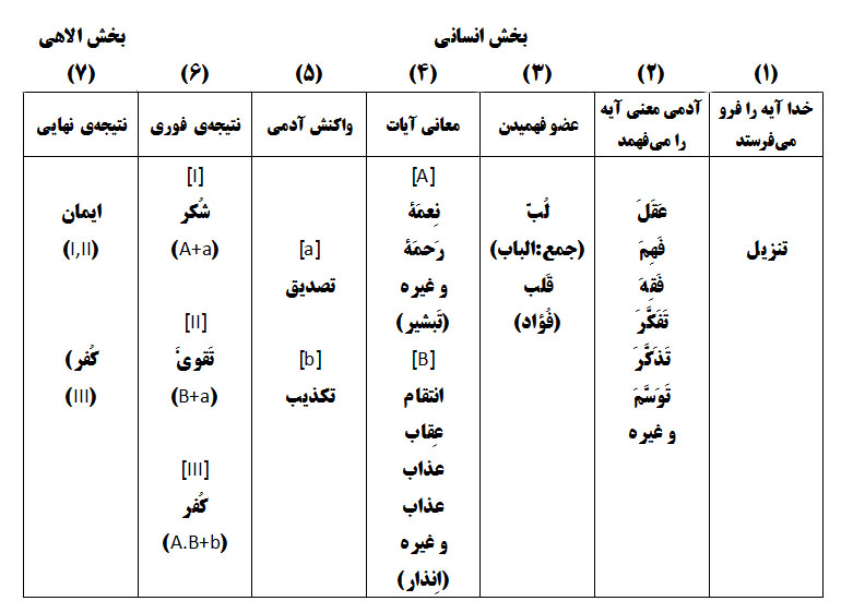 ستون بعدی (5) واکنش آدمی را در مقابل آیات نشان میدهد. واکنش اساسی بشری یا به صورت تصدیق یعنی «راست پنداشتن و باور کردن» آیات است، و یا به صورت تکذیب یعنی «دروغ پنداشتن و باور نکردن» به آنها. این دوشاخه شدن واکنش آدمی در برابر آیات اهمّیّت فراوان دارد، چه مستقیماً از یک طرف به باور کردن یا ایمان میانجامد، و از طرف دیگر به باور نکردن یا کفر. نتیجهی مستقیم این دو شاخه شدن واکنش بشری همراه با ساخت معنیشناختی آن در ستون 6 جدول آمده است. در آن صورت که آدمی لطف الاهی را که با آیات دستهی اوّل همراه است حقّ میپندارد –یعنی [a] + [A]- نتیجهی آن شکر [I] است به معنی دینی این کلمه. و در آن صورت که آیات دسته دوّم را میپذیرد و حقّ میشمارد- یعنی [a]+[B]- از آن تقویَْ [II] نتیجه میشود که معنی ابتدایی و اساسی آن ترس از مالک روز پاداش و کیفری است که خواهد بود. برخلاف، اگر آدمی آنچه را که در ذیل [A] آمده است باطل و دروغ پندارد – یعنی [b]+[A]- نیتجه کفر [III] است. چنانکه میدانیم همین کیفیّت دربارهی [B] نیز صدق میکند؛ سپس –[b]+[B][A]- کفر معنیا فنّی بی ایمانی پیدا میکند.
