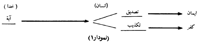 در بخش گذشته ساختمان کلّی میدان معنیشناختی را که در پیرامون کلمهی کانونی آیه تشکیل میشود، مورد بحث قرار دادیم. قسمت اساسی این میدان معنیشناختی را میتوان به اختصار چنین توصیف کرد: (1) خدا آیه را فرو میفرستد؛ (2) واکنش انسان چنان است که یا آن آیه را میپذیرد و حقّ میشمارد (تصدیق)، یا به عنوان اینکه باطل است منکر آن میشود (تکذیب)؛ (3) اوّلی طبیعتاً به ایمان میانجامد و دوّمی به کفر.