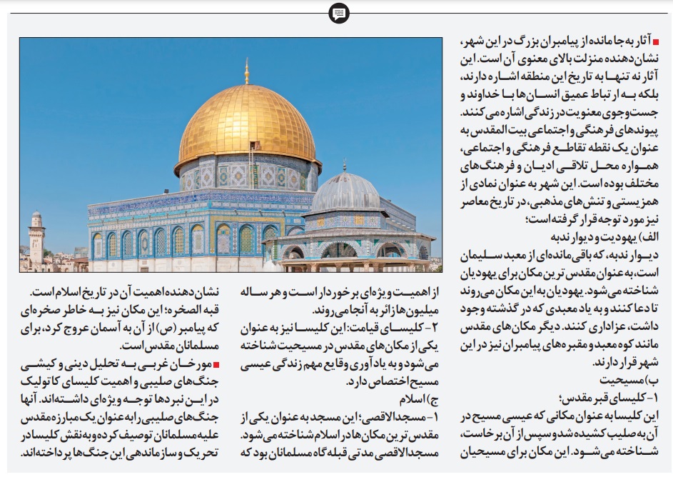 شهر بیتالمقدس و سرزمین فلسطین به عنوان یك مكان مقدس، در تاریخ و فرهنگ سه دین بزرگ آسمانی یعنی یهودیت، مسیحیت و اسلام، جایگاه ویژهای دارد. این شهر نه تنها به دلیل تاریخ غنی و آثار باستانیاش، بلكه به خاطر معنویت و اعتقادات عمیق پیروان این ادیان، اهمیت زیادی دارد.