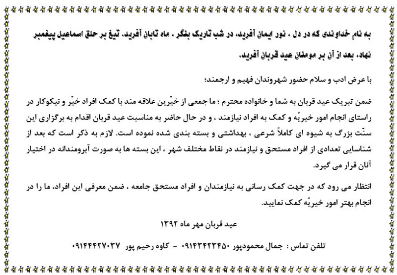 سنت حسنهی قربانی روز چهارشنبه ۲۴ مهر ماه ۱۳۹۲ توسط اعضای جماعت دعوت و اصلاح شهرستان در ساختمان مرجان گاز مهاباد برگزار گردید.