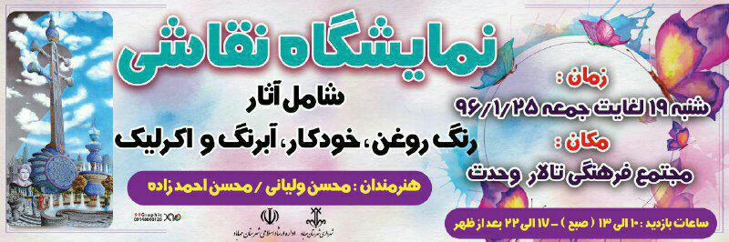 این نمایشگاه با همکاری اداره فرهنگ و ارشاد اسلامی، شورای شهر و شهرداری در سالن وحدت شهرداری مهاباد به مدت ١ هفته از ١٩ لغایت ٢٥ فرودینماه جاری در دو شیفت صبح از ساعت ١٠ الی ١٣ و عصر ١٧ الی ٢٢ برپا شده است و بازدید برای عموم آزاد است.