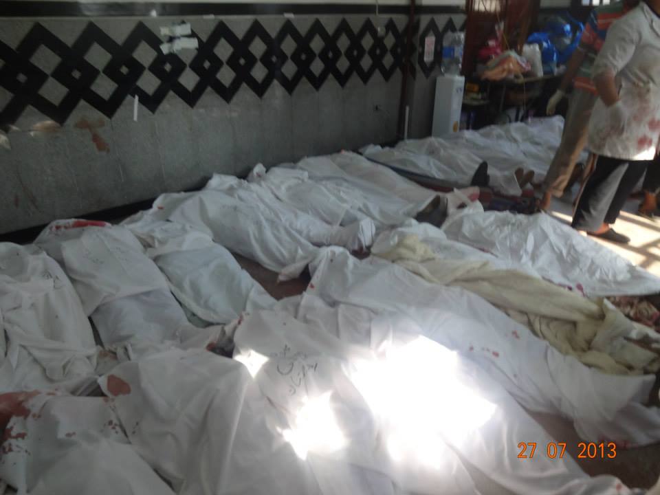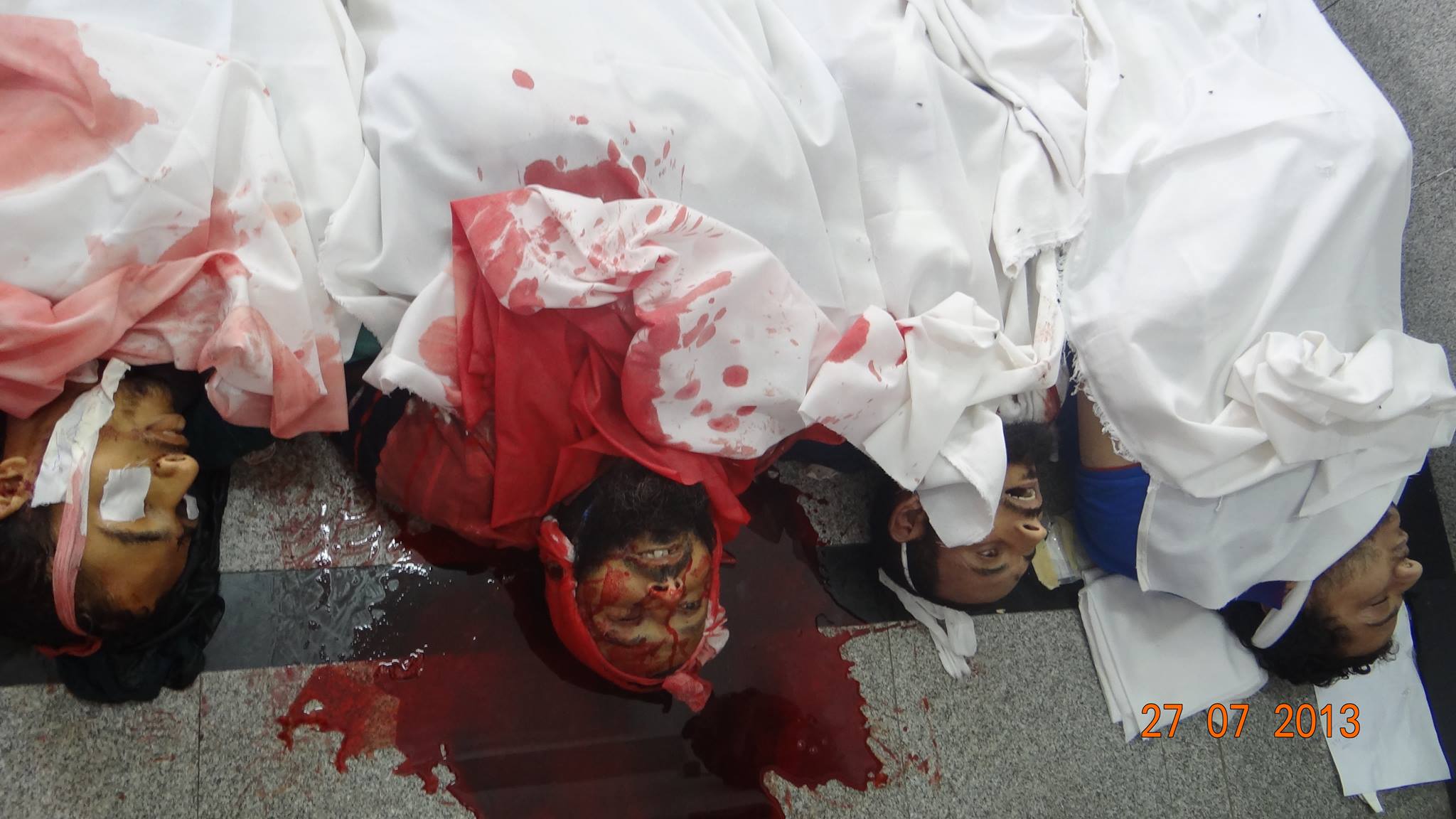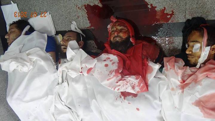 بنا به گزارش اخوانآنلاین، بیمارستان سیار میدان چهارم رابعه عدویه از افزایش شهدا به بیش از ۲۰۰ نفر خبر داد. علاوه بر این ۴۵۰۰ هزار نفر از متحصنین روزهدار مسالمتجوی طرفدار شرعیت در میدان رابعه مجروح شدهاند که بیشتر آنها بوسیلهی تکتیراندازی نیروهای امنیتی در خیابان نصر مورد اصابت قرار گرفتهاند.