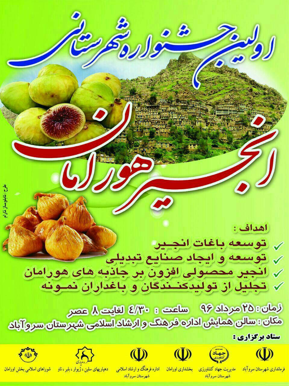 اولین جشنواره «انجیر هورامان» با حضور مسؤولان استانی و شهرستانی و باغداران و تولیدکنندگان نمونه، چهارشنبه ٢٥ مردادماه در سروآباد برگزار شد.