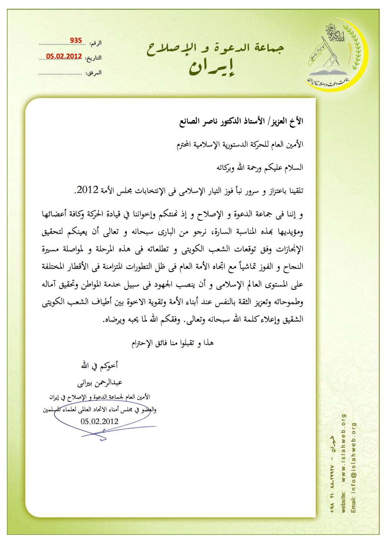 در پی پیروزی چشمگیر اسلامگرایان در انتخابات اخیر پارلمانی کویت، استاد عبدالرحمن پیرانی، دبیرکل جماعت، طی نامهای این دستاورد را به دکتر ناصر الصانع دبیرکل جنبش اسلامی قانون اساسی این کشور شادباش گفت.