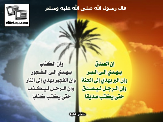 «عَلَیْکُمْ بِالصِّدْقِ فَإِنَّ الصِّدْقَ یَهْدِی إِلَى الْبِرِّ وَإِنَّ الْبِرَّ یَهْدِی إِلَى الْجَنَّةِ وَمَا یَزَالُ الرَّجُلُ یَصْدُقُ وَیَتَحَرَّى الصِّدْقَ حَتَّى یُکْتَبَ عِنْدَ اللَّهِ صِدِّیقًا، وَإِیَّاکُمْ وَالْکَذِبَ فَإِنَّ الْکَذِبَ یَهْدِی إِلَى الْفُجُورِ وَإِنَّ الْفُجُورَ یَهْدِی إِلَى النَّارِ وَمَا یَزَالُ الرَّجُلُ یَکْذِبُ وَیَتَحَرَّى الْکَذِبَ حَتَّى یُکْتَبَ عِنْدَ اللَّهِ کَذَّابًا» [متفق علیه].