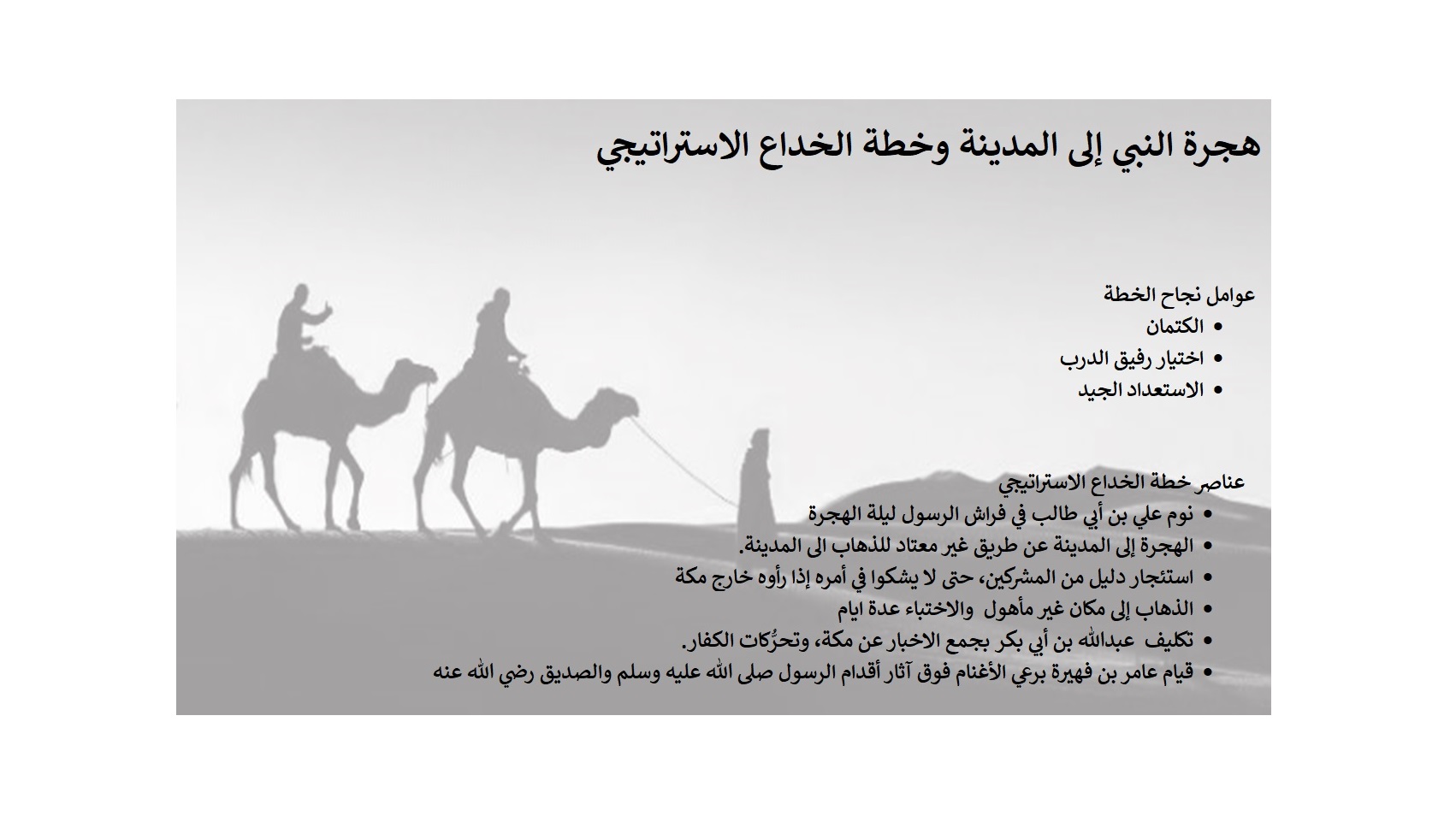 ۲- پیامبر دستور داد مسلمانان از مکه هجرت کنند آن هم بهمنظور تهیه مکانی جهت حضور مسلمانان در خارج مکه و حتی جزیره عرب؛ چرا که اگر یکی از توطئههای قریش - آن گونه که قراین و علایم حاکی است - این بود که قریش در صدد است مسلمانان مکه را قتلعام و ریشهکن نماید، رسول خدا بهمنظور خنثی نمودن این برنامه شوم و شیطانی دستور داد مسلمانان از شهر خارج شوند و بهسوی مدینه بروند؛ چرا که آن جا کسانی هستند که برای محافظت از رسالت نبوی و ادامهدادن به راه رسالت، جانبرکفاند و متعهد شدهاند که غمخوار این دین بوده و برای رساندن آن به مردم مضایقه نکنند؛ در واقع آنان بیشتر شبیه خمیرمایهای هستند که برای آیندهی درخشان اسلام و مسلمین تربیت و آماده شدهاند!