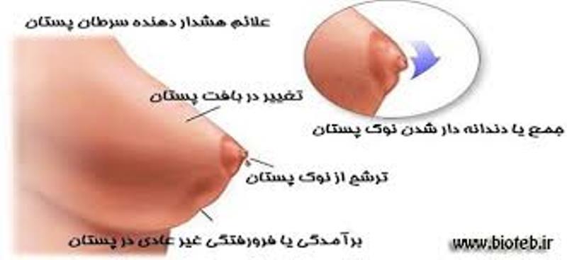 •تغییرات نوک پستان: به داخل کشیده شدن یا برگشتن نوک پستانها، قرمزی و پوسته پوسته شدن همراه با خارش و یا هر تغییری در نوک پستانها مهم تلقی میشود و باید بررسی شود.