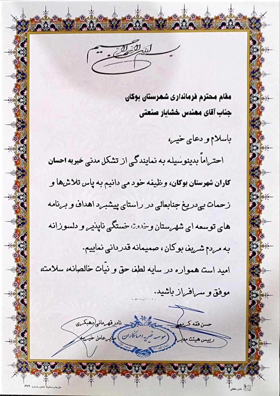 در پایان جلسه، اعضای هیئتمدیره با اهدای لوح سپاس و یک جلد ترجمهی فارسی قرآن مجید، اثر عبدالرحمان پیرانی، دبیرکل جماعت دعوت و اصلاح، از حمایتهای فرماندار بوکان قدردانی کردند.