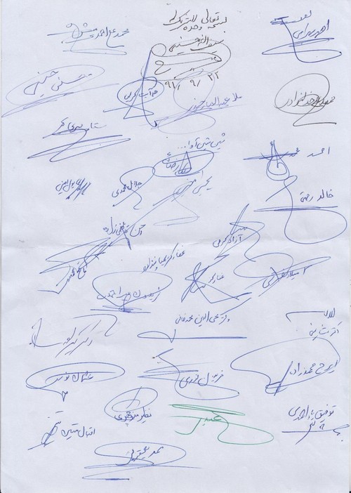 ۱ـ ماموستا احمد بهرامی. ۲ـ ماموستا سیف الله حسینی. ۳ـ محمد علی احمدی منش. ۴ـ حسین حسینی. ۵ـ احمد محمدی. ۶ـ رسول رضائی ۷ـ خالد رحمتی. ۸ـ دکتر توفیق میراحمدی. ۹ـ محمد علی خدامرادی. ۱۰ـ فریدون میراحمدی سرپرست انجمن خانای قبادی. ۱۱ـ دکتر فریدون نوری. ۱۲ـ دکتربرهان مشایخی. ۱۳ـ دکترمحیالدین محمد خانی. ۱۴ـ دکتر محمد یعقوبی. ۱۵ـ ماموستا یحیی امینی. ۱۶ـ عبدالرحیم عبداللهی. ۱۷ـ صابر مرادی. ۱۸ـ همایون امینی. ۱۹ـ اسماعیل محمودی. ۲۰ـ عثمان نوری ۲۱ـ توفیق یاراحمدی. ۲۲ـ محمود سعیدزاده. ۲۳ـ مسعود کرمی. ۲۴ـ ماموستا ستار پیری. ۲۵ـ فتاح حسینی. ۲۶ـ ایرج محمدزاده. ۲۷ـ محیالدین عبدی. ۲۸ـ کمال امینی. ۲۹ـ اقبال متین. ۳۰ـ نظیر منوچهری. ۳۱ـ جلال محمدی. ۳۲ـ عطاء رحمانی. ۳۳ـ سیروس سلیمانی. ۳۴ـ آیت سعیدی. ۳۵ـ فاتح محمدی. ۳۶ـ وهاب چراغی. ۳۷ـ حسیم مرادی. ۳۸ـ مهندس محیالدین امینی. ۳۹ـ عادل احمدی. ۴۰ـ ماموستا عبدالجبار حیدری. ۴۱ـ فریدون رضایی