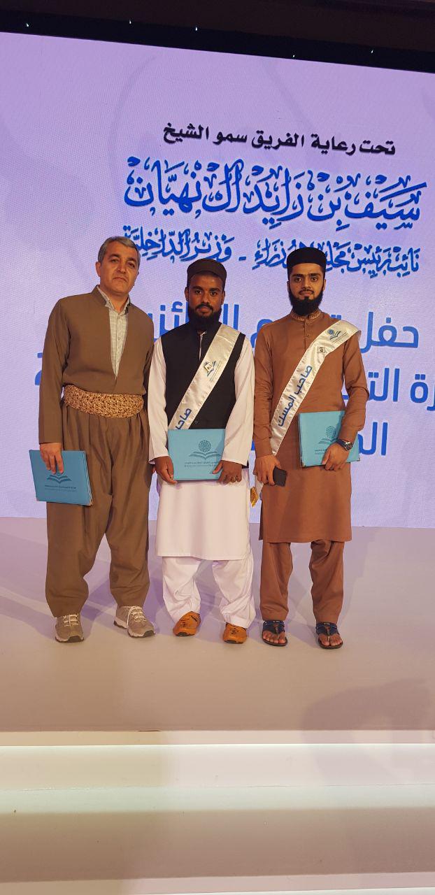 وی دیروز چهارشنبه ٨ خردادماه جاری، در مراسم اختتامیه مسابقات که در شهر ابوظبی پایتخت امارات برگزار شد، لوح تقدیر و جایزهاش را با لباس محلّی کُردی از نخستوزیر امارات دریافت نمود.