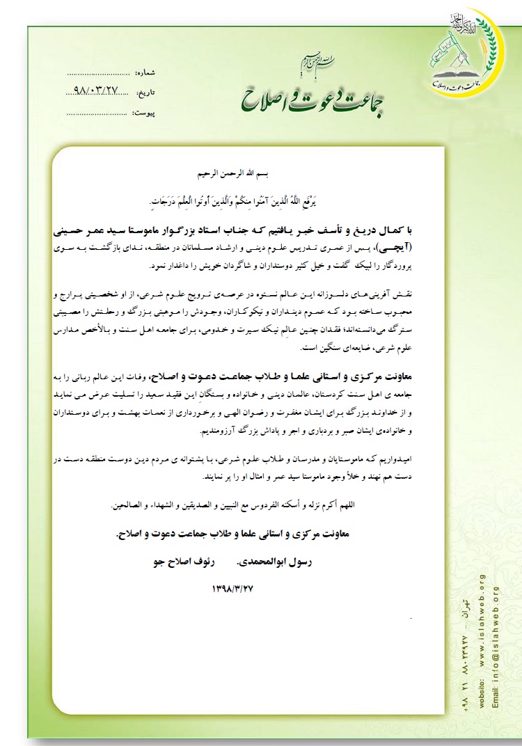 معاونت مرکزی و استانی علما و طلاب جماعت دعوت و اصلاح، وفات این عالم ربانی را به جامعه‌ی اهل سنت کردستان، عالمان دینی و خانواده و بستگانِ این فقید سعید را تسلیت عرض می‌نماید و از خداوند بزرگ برای ایشان مغفرت و رضوان الهی و برخورداری از نعمات بهشت و برای دوستداران و خانواده‌ی ایشان صبر و بردباری و اجر و پاداش بزرگ آرزومندیم.