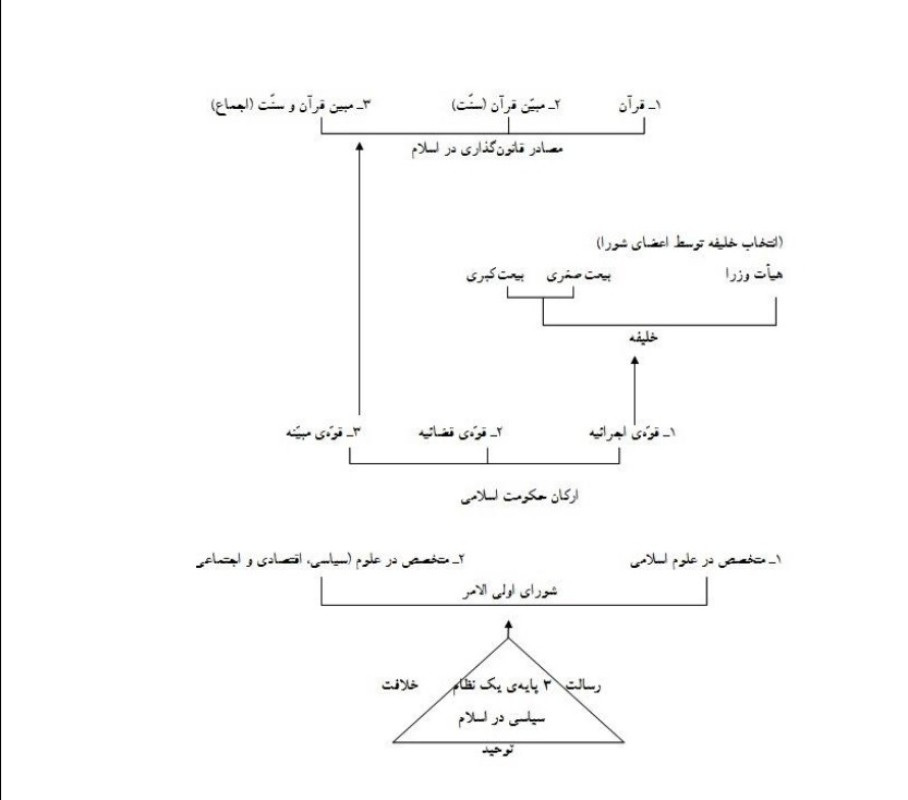 سپس بعد از توضیح در مورد حکومت اسلامی، ارکان سه گانهی آن را بیان، و تصریح میکند: «حکومت اسلامی دارای سه رکن «اجرایی، مقننّه و قضائی» مثل سایر حکومتهای موجوداست. طبق آیه ۵۵ سورهی نور، تمام افراد جامعه مورد خطاب قرار میگیرند، و با تحقق دوامر: ۱ـ ایمان ۲ـ صالح بودن، همهی انسانها، شایستگی خلافت در زمین را دارا میباشند، اضافه میکند مقام خلافت اختصاص به فردی خاص نیست، بلکه هر کسی دارای دو شرط فوق باشد، شایستگی این مقام را دارد. امّا چون همهی مؤمنان نمیتوانند ادارهی جامعه را بر عهده بگیرند، لذا مؤمنان عدّهای را برای اداره جامعه انتخاب میکنند.» ۹