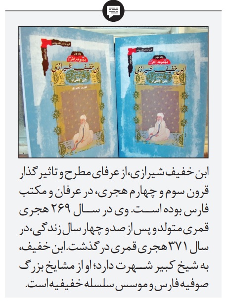 علیاصغر محمدخانی: شهر شیراز، آرامگاه چهار نامدار ایرانی را در خود جای داده است؛ حافظیه و سعدیه را همه میشناسند؛ اما از آرامگاه ابن خفیف، كه در نزدیكی بازار و مسجد وكیل، در حیاط یك كتابخانه عمومی است، كمتر كسی مطلع است؛ حتی اهالی شیراز. آرامگاه روزبهان بقلی فسایی، معروف به شیخ روزبهان هم در جنوب خیابان لطفعلی خان زند، غریب مانده است. ابن خفیف شیرازی، از عرفای مطرح و تاثیرگذار قرون سوم و چهارم هجری، در عرفان و مكتب فارس بوده است. وی در سال ۲۶۹ هجری قمری متولد و پس از صد و چهار سال زندگی، در سال ۳۷۱ هجری قمری درگذشت. ابن خفیف، به شیخ كبیر شهرت دارد؛ او از مشایخ بزرگ صوفیه فارس و موسس سلسله خفیفیه است. ابوالحسن دیلمی، از شاگردان اوست. وی كتابی در سیرت استاد خود نگاشته كه برگرفته از دیدهها و شنیدههایش است؛ بسیاری از خُلقیات و احوالات ابن خفیف را میتوان از لابهلای صفحات همین كتاب استخراج كرد. اصل كتاب یاد شده كه به زبان عربی نوشته شده، از میان رفته است، اما ترجمه فارسی آن، به قلم رُكنالدین یحیی جُنید شیرازی در دست است؛ این كتاب، مهمترین مأخذ درباره زندگی ابن خفیف شیرازی است. كتاب «سیرت ابن خفیف»، سه دهه پیش، به سعی آنهماری شیمل، عرفانپژوه آلمانی، تصحیح و به همت توفیق سبحانی منتشر گردید. دو سال پیش نیز، «سیرت ابن خفیف» با ترجمه تاجالدین كربالی را مجتبی مجرد تصحیح و انتشارات بنیاد موقوفات افشار چاپ كرد. از طریق مطالعه كتاب «سیرت ابن خفیف»، علاوه بر اطلاع از زندگی، منش و آثار وی، میتوان با حال و هوای تصوف قرن چهارم هجری در اقلیم فارس، كه تأملات فراوانی با تصوف بغداد داشته، آشنا شد؛ همچنین، كتاب مفیدی برای شناخت تاریخ اجتماعی ایران است. اثر دیگر درباره ابن خفیف یكی مدخل ابن خفیف، در فرهنگنامه بزرگ اسلامی كه به قلم فتحالله مجتبایی است، اشاراتی اجمالی درباره این عارف بزرگ را در خود جای داده است. در سال جاری، كتاب دیگری نیز در احوال و آثار ابن خفیف، به سعی زرینتاج واردی، توسط بنیاد فارسشناسی منتشر شده است.