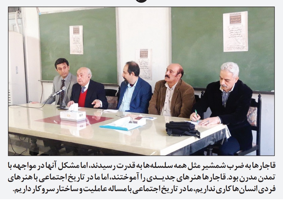 در ادامه بحث مجلسی با اشاره به سقوط صفویه افزود كه پس از صفویه دوباره قبایل هستند كه به نوبت قدرت را در ایران به دست می‌گیرند. در این فاصله قاجاریان همواره رقیبی مهم برای این حكومتگران برآمده از خاستگاه ایلیاتی بودند. قاجاریان كه جنگاورانی توانمند بودند در ابتدا از حامیان سلسله‌ صفویه بودند و در استقرار و تثبیت صفویان و بسط و گسترش تشیع اثنی‌عشری می‌كوشیدند. قاجارها كه از طوایف مختلف تشكیل شده بودند، در نقاط مختلف مستقر شده بودند كه شرزه‌ترین طوایف آنها در استرآباد ساكن شدند و دو طایفه مهم دولو و قویونلو ریاست آنها را بر عهده داشتند. سرانجام این دولوها بودند كه به نفع قویونلوها از قدرت كنار رفتند، اما شریك آنها در حكمرانی طی سلطنت سلسله‌ قاجاریه شدند. به هر روی از این تعداد قاجاریان عده بسیار اندكی تا روز سقوط سلطنت قاجاریه با شاه قاجاری همراهی كردند و این كتاب نشان می‌دهد كه این قاجاریان چگونه با منافع انحصاری كه در اختیار داشتند به تدریج از شرزگی نظامی فاصله گرفتند و صاحب املاك و به كار ملاكی و تجارت مشغول شدند. در نتیجه به جای شمشیر زدن برای حفظ حكومت و كمك كردن به آن از حكومت قاجاری توقع‌هایی داشتند و به نوعی رانت‌بگیران حكومت قاجاری شده بودند.