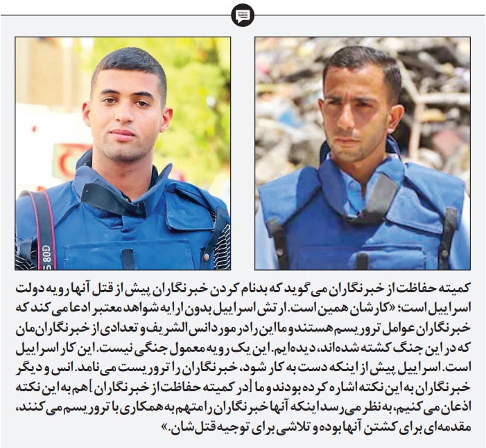 هر دوی این مردان اکنون در فهرست طولانی خبرنگارانی هستند که نیروهای اسراییلی پس از ادعاهای ارتباط آنها با سازمانهای تروریستی، به قتل رساندهاند. اسراییل برای بدنام کردن روزنامهنگاران از عکسها و پستهای بیربط و جعلی و پیامهای ساختگی و دروغی استفاده میکند. لشکری از حسابهای کاربری در شبکههای اجتماعی این اطلاعات غلط را به صورت انبوه پیش و پس از قتل و ترور روزنامهنگاران منتشر میکنند تا فضای اطلاعرسانی را آلوده کنند.