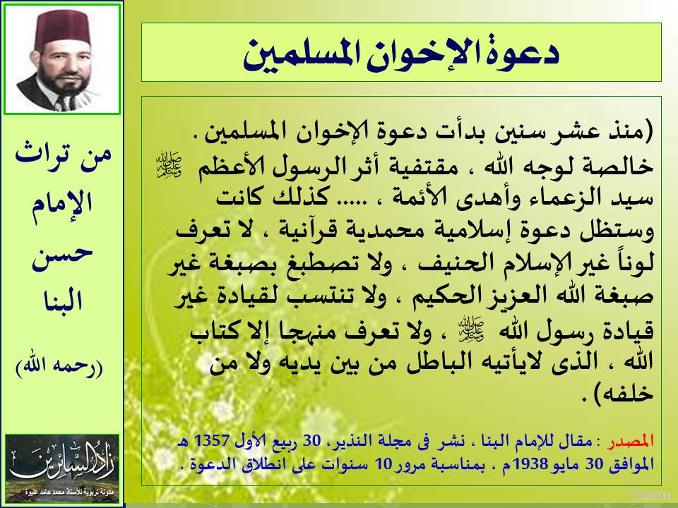 •         حمد و سپاس خدای را سزد که پروردگار جهانیان است و درود و سلام بر پیامبر امینش؛ محمد بن عبدالله و بر خاندان و یاران و دوستدارانش. دعوت اخوان المسلمین، دعوتی اسلامی و اصیل است که به ارزش‌ها و اصول دینی فرا می‌خواند. این دعوت، نیرویش را از برنامه‌ی ربانی و سرچشمه‌ی قرآنی و هدایت نورانی پیامبرش می‌گیرد؛
