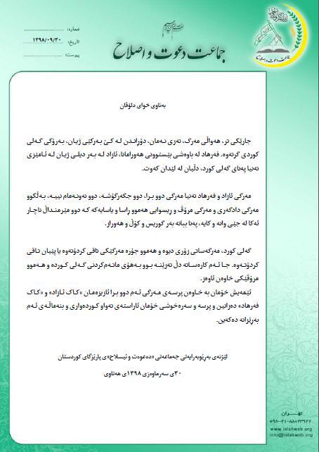 لێژنەی بەڕێوبەرایەتی پارێزگای کوردستان بەبۆنەی ڕەقبوونەوەی دوو مێرمنداڵی کۆڵبەر لە مەریوان، برووسکەی سەرەخۆشی بڵاوکردەوە. دەقی برووسکە و پەیامە بەمجۆرەیە: