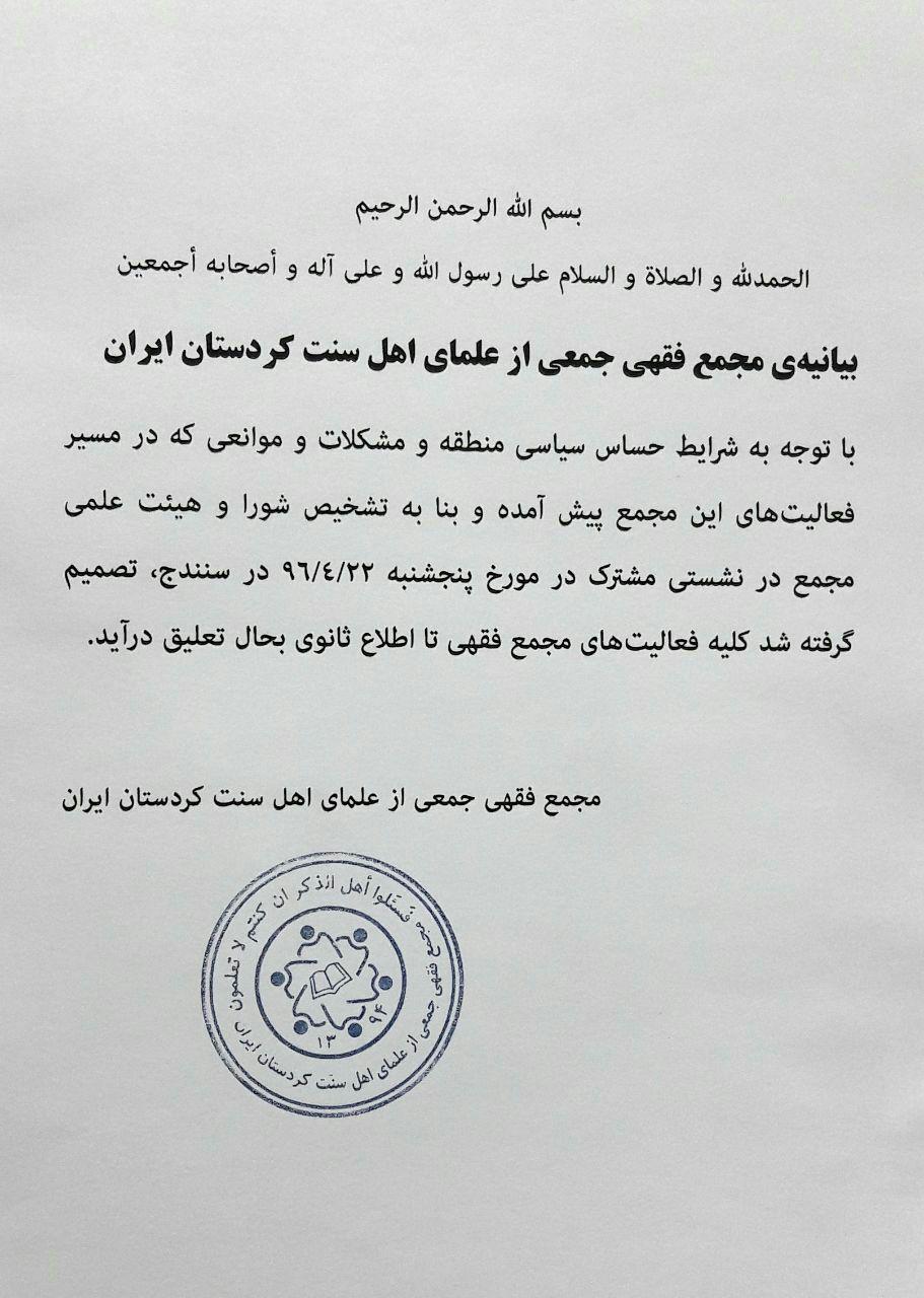 لێژنەی فەتوای کۆمەڵێک لە زانایانی سوننەی کوردستانی ئێران، دوێنێ پێنج شەممە، 22ی پووشپەڕی بە دەرکردنی بەیانییەیەک کۆتایی ئیش و کاری خۆی ڕاگەیاند.
