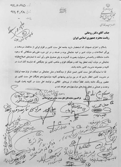 فراکسیۆنی سوننەی پاڕلەمانی ئێران لە نامەیەکدا کە ئاراستەی سەرۆک کۆماری ئێران کرد، داوای کەڵک وەرگرتن لە ھێزە کارا و تواناکانی ئەھلی سوننەت لە پێکھێنانی کابینەی دوازەھەمدا کرد.