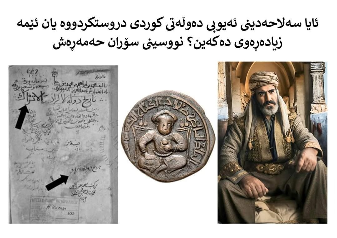 - وێنەکان لە ڕاستەوە، وێنەی یەکەم زیرەکی دەستکرد کردوویەتی. کاتێک داوای لێکراوە کە وێنەی سەلاحەدینی ئەیوبی بکێشیت ئەو وێنەیەی کێشاوە. وێنەی دووهەم دراوێکی ئیمپراتۆریەتی کوردی ئەیوبیە لە میسر. وێنەی سێهەم وێنەی ئەو دەستنووسەیە کە مێژووی ئەیوبیەکانی تێدا نووسراوە لەژێر ناونیشانی «تاریخ دولة الاکراد»"مێژووی دەوڵەتی کوردان" و دواتر کەسێک بە قەڵەمێکی نوێ "والاتراك" ی بۆ زیادکردووە بە ئامانجی گۆڕینی ئەو مێژووە کوردیە.